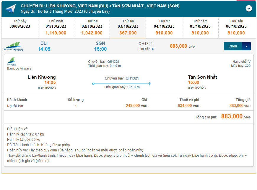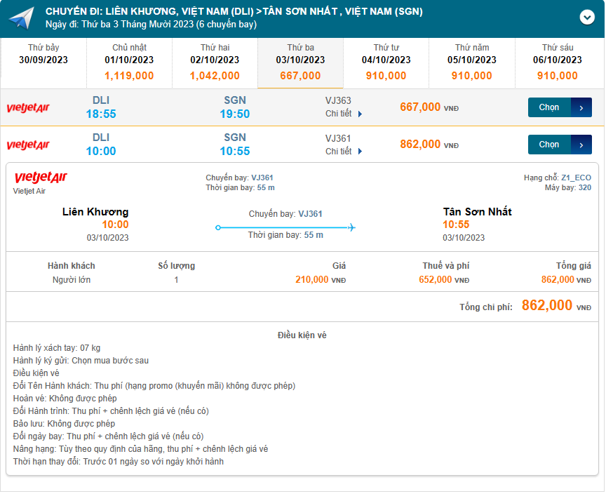 Liên Khương (DLI) đến Tân Sơn Nhất (SGN) thứ ba 03/10/2023