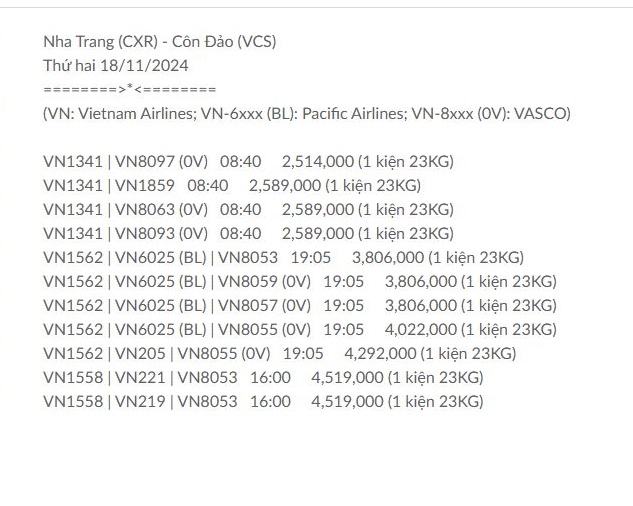 Nha Trang (CXR) - Côn Đảo (VCS) Thứ hai 18/11/2024