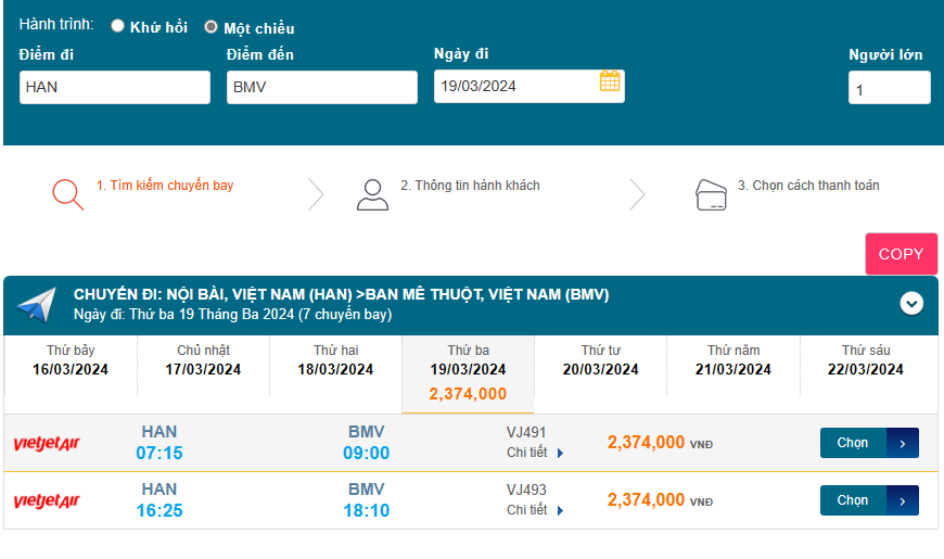 Nội Bài (HAN) - Ban Mê Thuột (BMV) 19/03/2024
