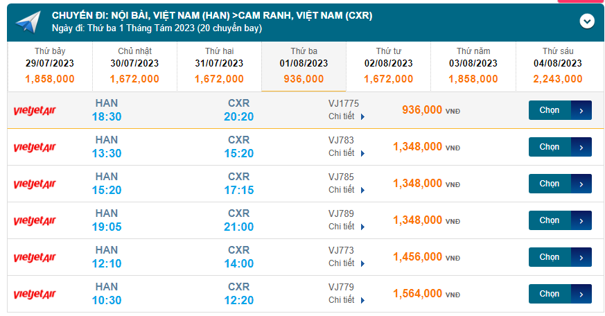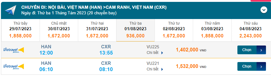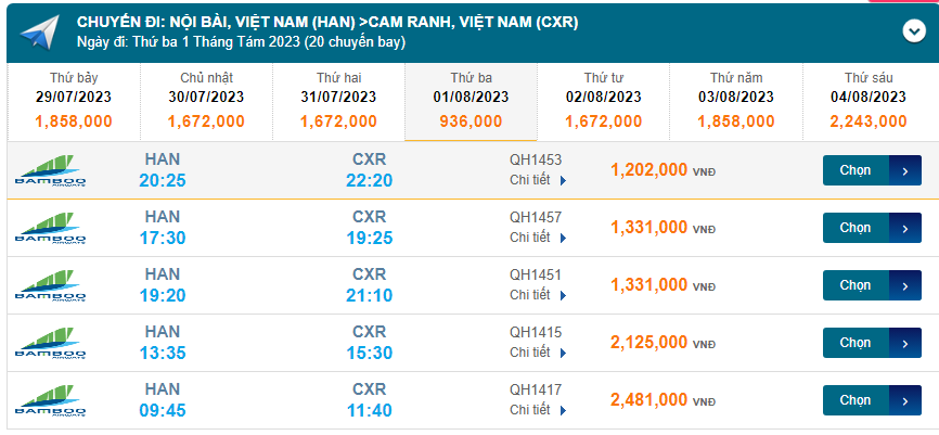 Nội Bài (HAN) đến Cam Ranh (CXR) Thứ ba 01/08/2023