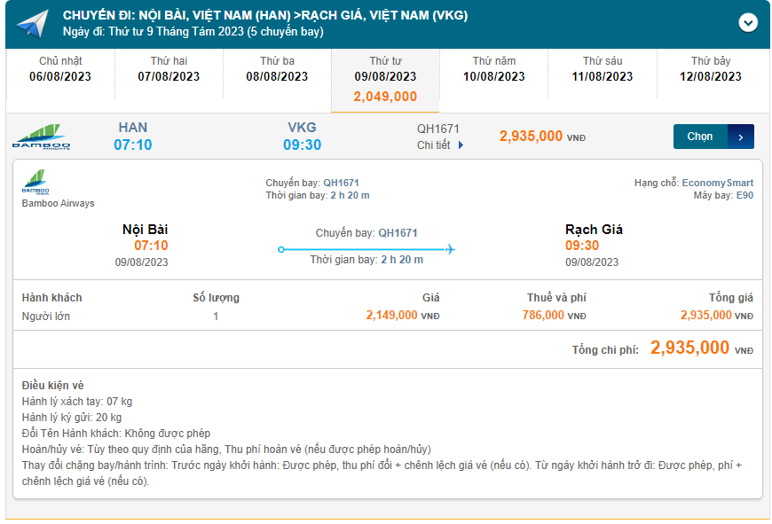 Nội Bài (HAN) đến Rạch Giá (VKG) Thư tư 09/08/2023