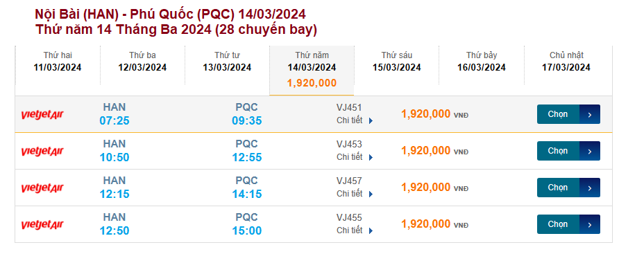 Nội Bài (HAN) - Phú Quốc (PQC) 14/03/2024
