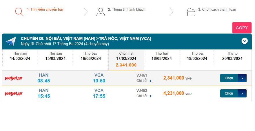 Nội Bài (HAN) - Trà Nóc (VCA) 17/03/2024