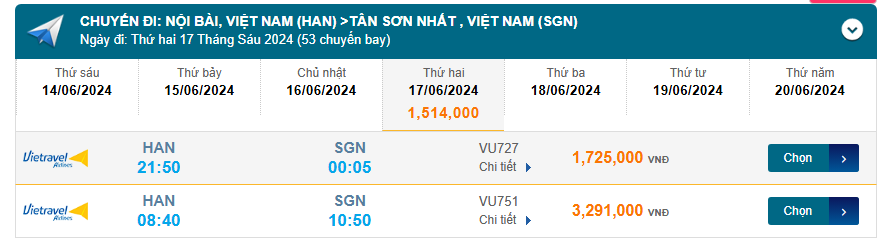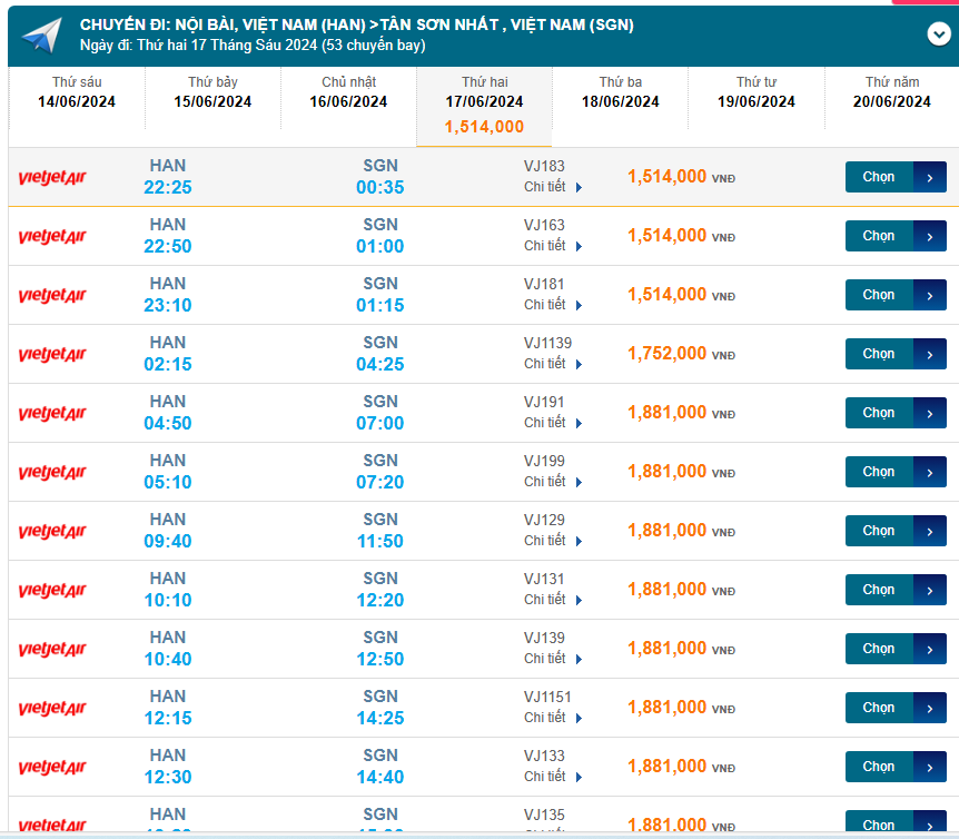 Nội Bài(HAN) - Tân Sơn Nhất (SGN) 17/06/2024
