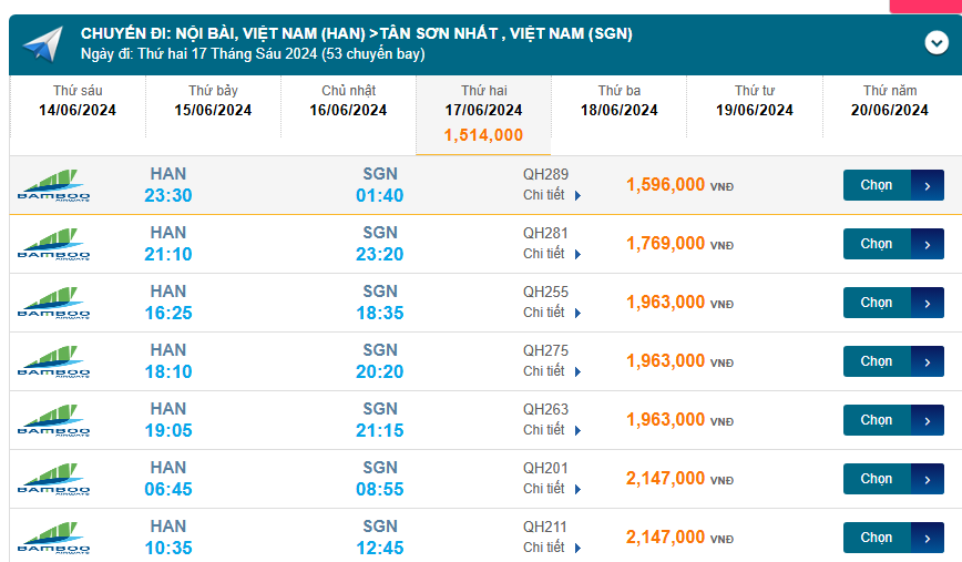 Hãng Bamboo Airways QH201 -> 06:45 giá vé máy bay 2,147K