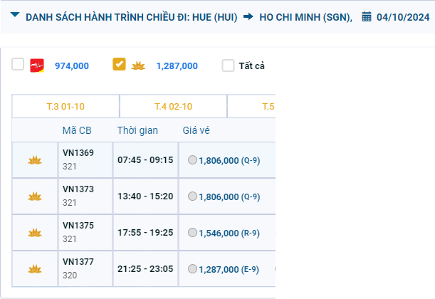 Phú Bài (HUI) - Tân Sơn Nhất (SGN) 04/10/2024