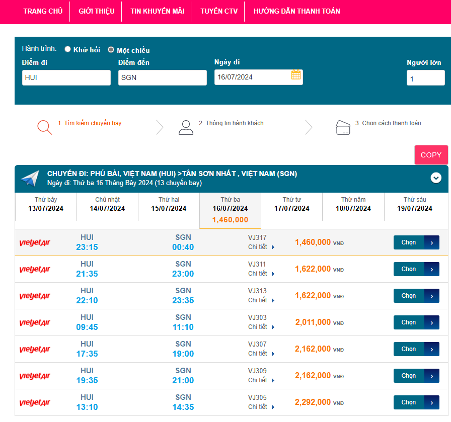 Phú Bài (HUI) - Tân Sơn Nhất (SGN) 16/07/2024