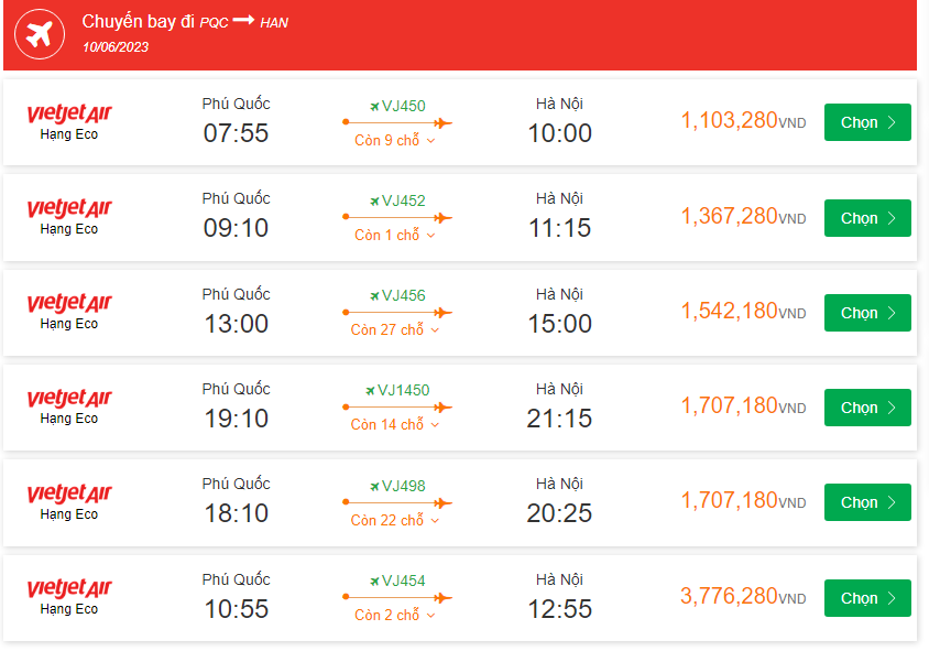 Vietjet Air Phú Quốc Cất cánh: 13:00 Ngày: 10-06-2023 Hà Nội Hạ cánh: 15:00 Ngày: 10-06-2023 Chuyến bay: VJ456 giá vé máy bay 1,542,180VND