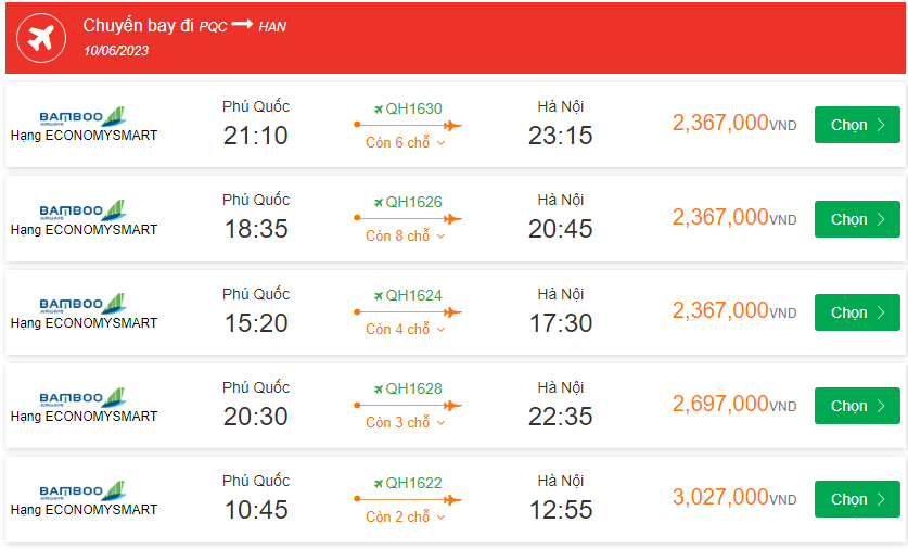 Bamboo Airways Phú Quốc Cất cánh: 15:20 Ngày: 10-06-2023 Hà Nội Hạ cánh: 17:30 Ngày: 10-06-2023 Chuyến bay: QH1624 giá vé máy bay 2,367,000VND