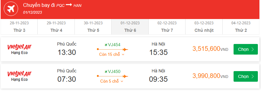 Phú Quốc (PQC) Đến Hà Nội (HAN thứ sáu 01-12-2023