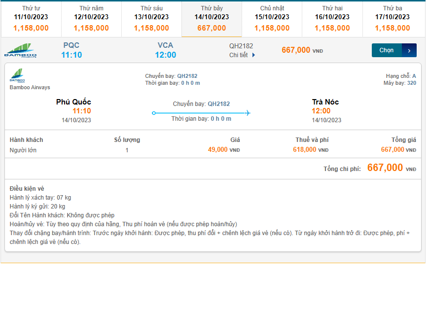 Phú Quốc (PQC) đến Trà Nóc (VCA) thứ bảy 14/10/2023