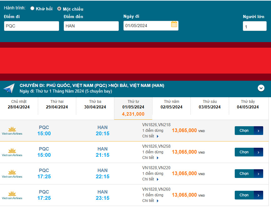Phú Quốc (PQC) - Nội Bài (HAN) 01/05/2024