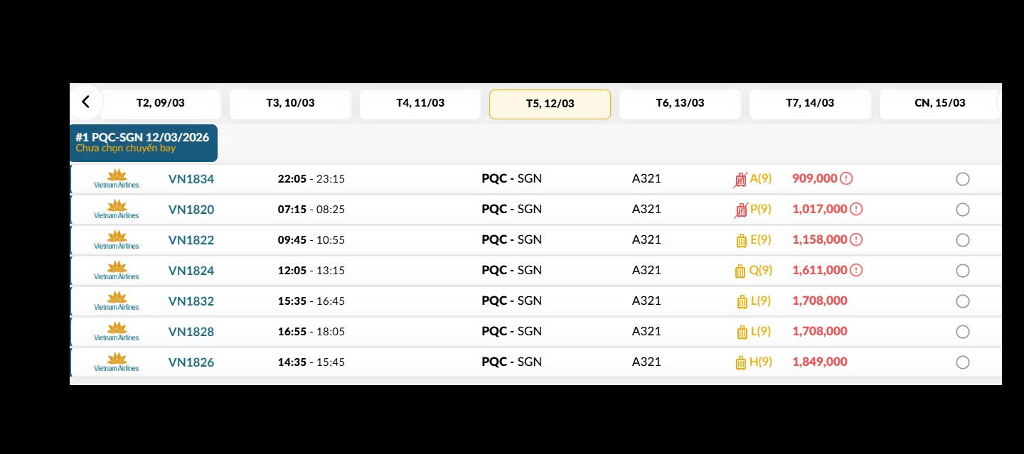 Phú Quốc (PQC) - TP. Hồ Chí Minh (SGN) Thứ năm 12/03/2026