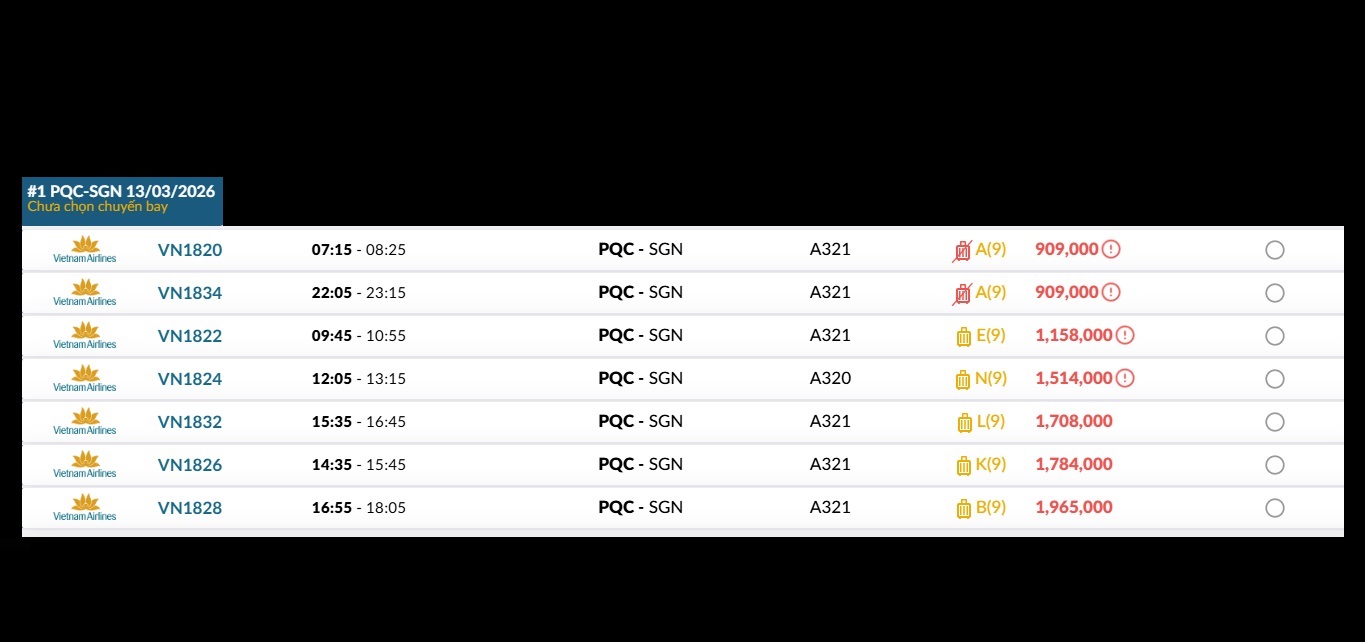 Phú Quốc (PQC) - TP. Hồ Chí Minh (SGN) Thứ sáu 13/03/2026
