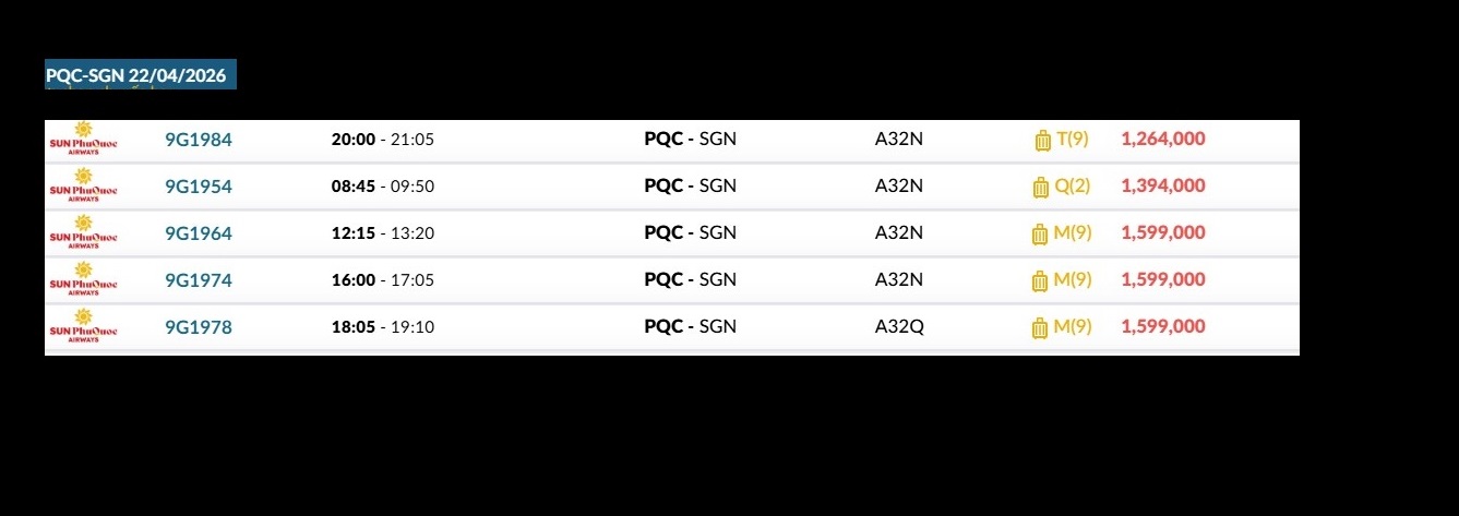 Phú Quốc (PQC) - TP. Hồ Chí Minh (SGN) Thứ tư 22/04/2026