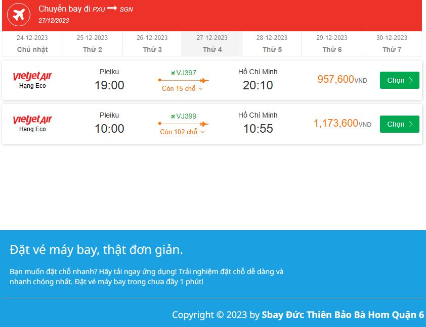 Pleiku (PXU) Đến Hồ Chí Minh thứ tư 27-12-2023
