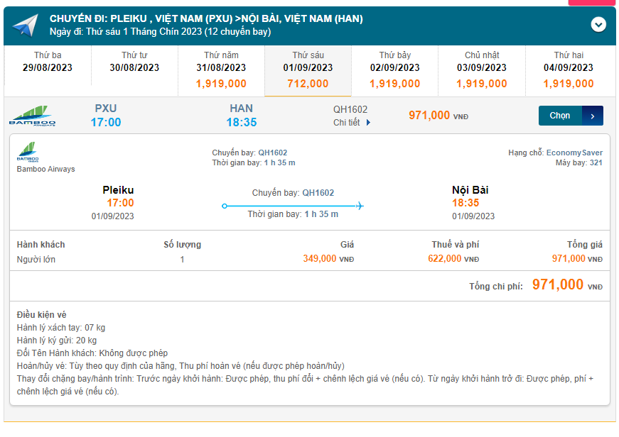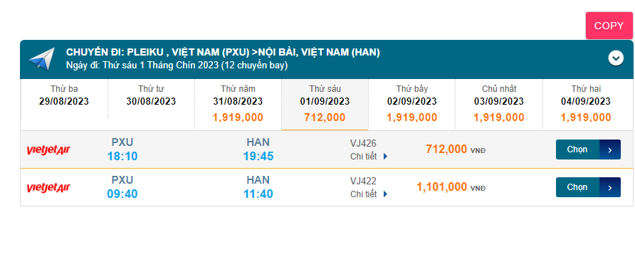 Pleiku (PXU) đến Nội Bài (HAN) thứ sáu 01/09/2023