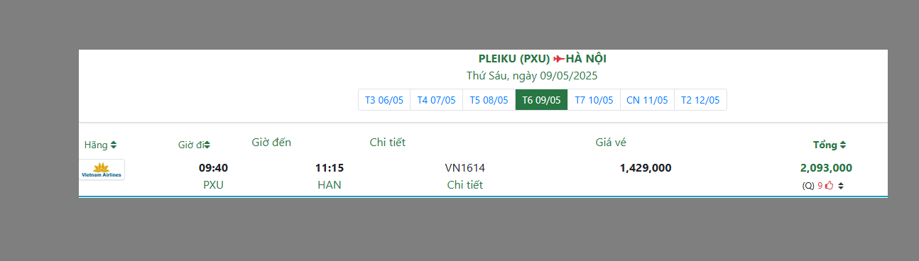 PLEIKU (PXU) HÀ NỘI Thứ Sáu, ngày 09/05/2025