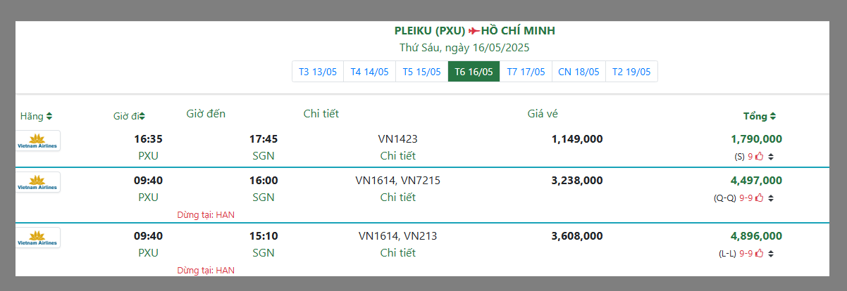 PLEIKU (PXU) HỒ CHÍ MINH Thứ Sáu, ngày 16/05/2025
