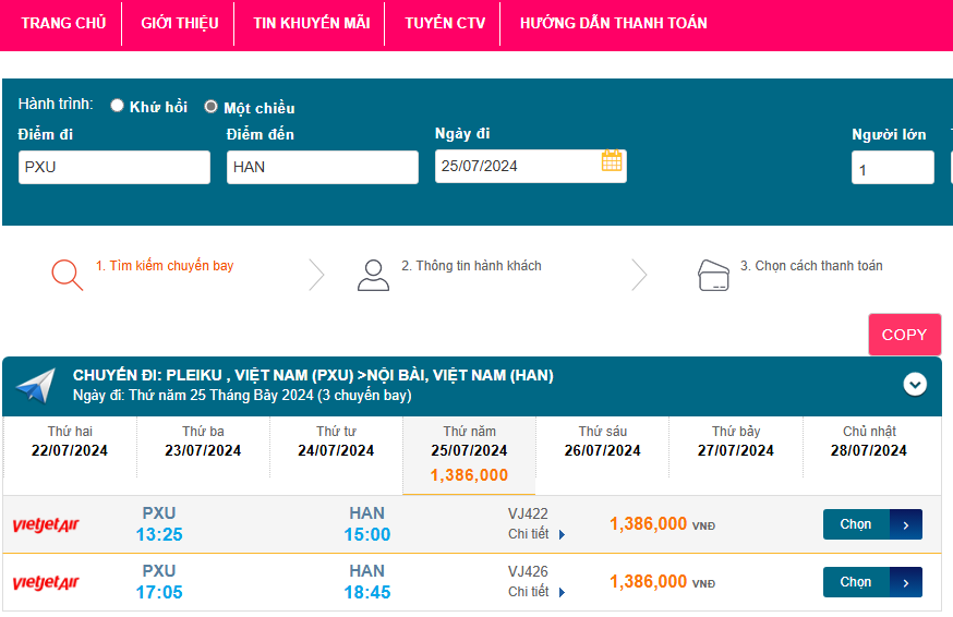 Pleiku (PXU) - Nội Bài (HAN) 25/07/2024