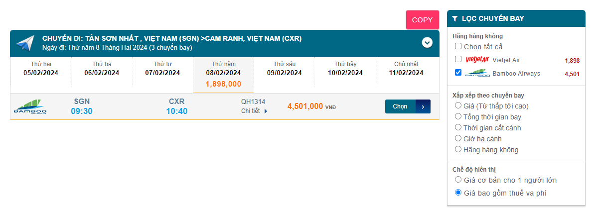 Tân Sơn Nhất - Cam Ranh (CXR) 08/02/2024 Mồng 29/12/2023