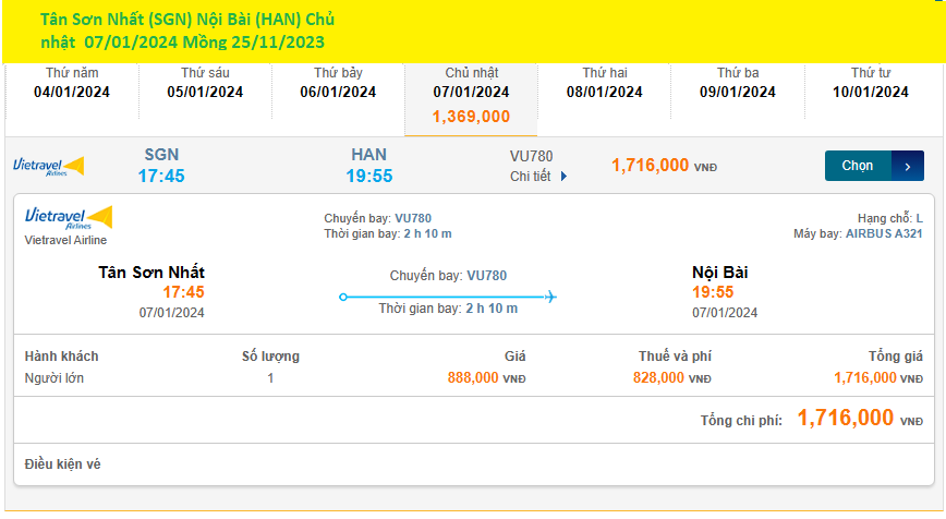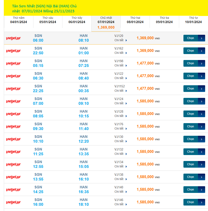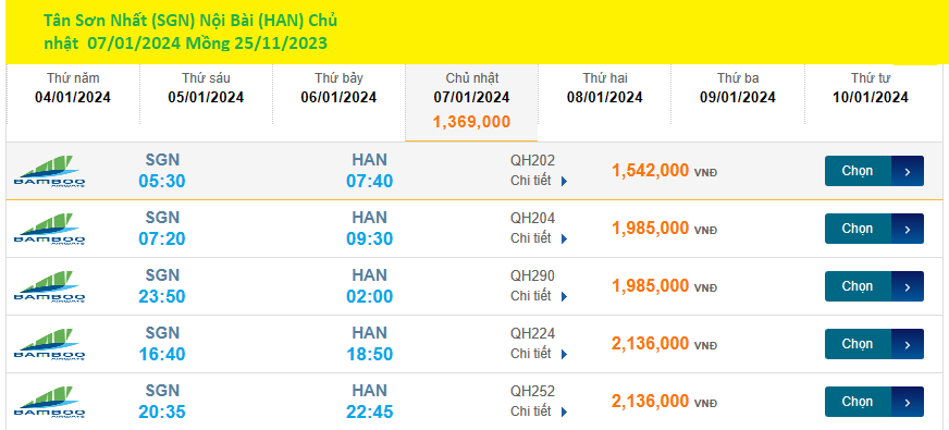 Tân Sơn Nhất Nội Bài Chủ nhật 07/01/2024 Mồng 26/11/2023