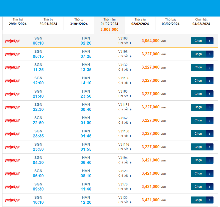 Tân Sơn Nhất - Nội Bài (HAN) 01/02/2024 Mồng 22/12/2023