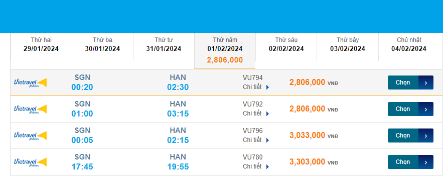 Hãng Vietravel Airline VU794 -> 00 : 20 giá vé máy bay 2,806K