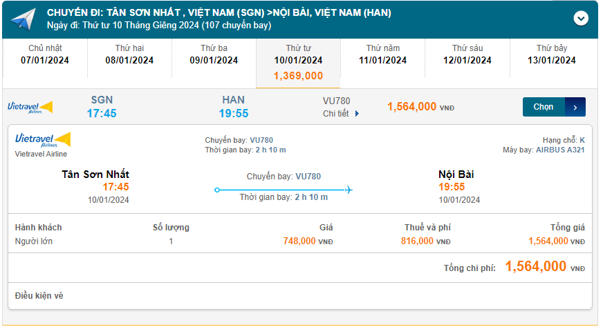 Tân Sơn Nhất - Nội Bài (HAN) 10/01/2024 Mồng 29/11/2023