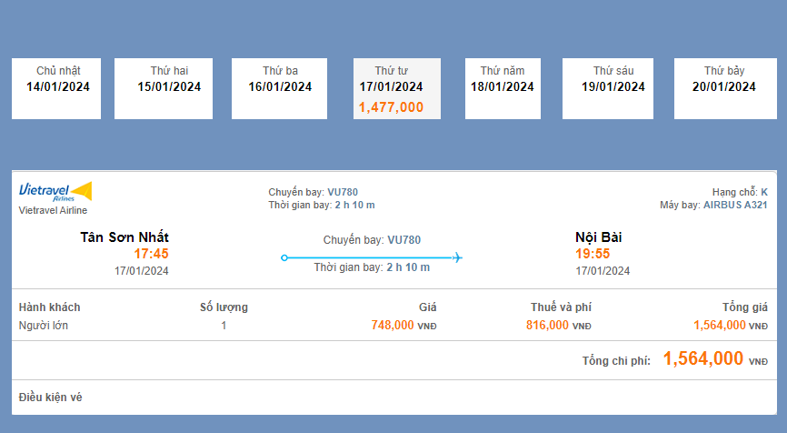 Hãng Vietravel Airline VU780 -> 17 : 45 giá vé máy bay 1,564K
