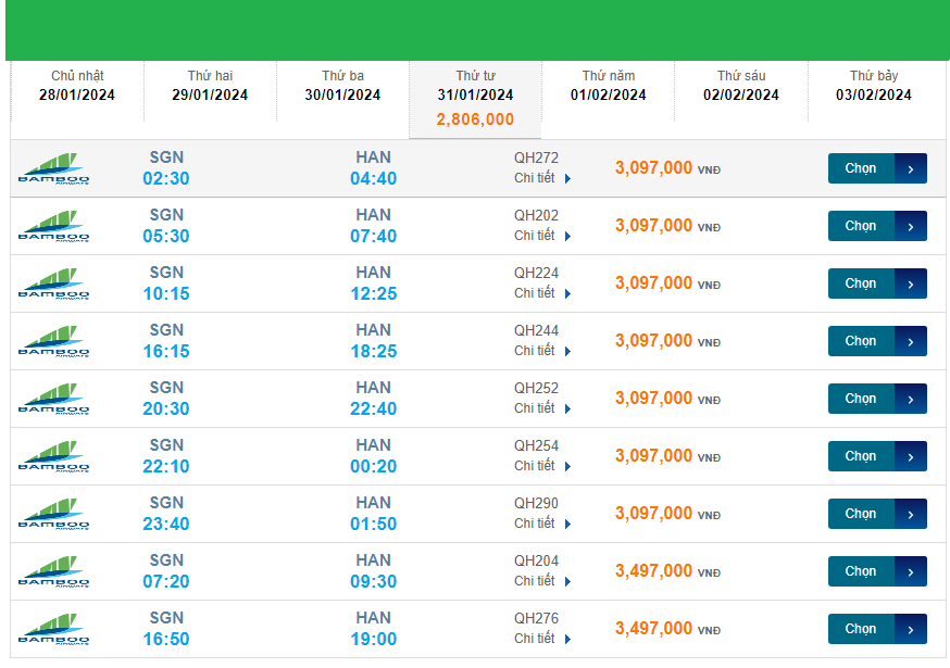 Hãng Bamboo Airway QH272 -> 02 : 30 giá vé máy bay 3,097K