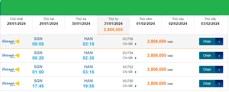 Hãng Vietravel Airline VU796 -> 00 : 05 giá vé máy bay 2,806K