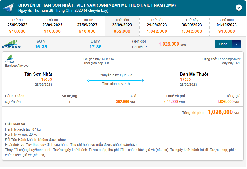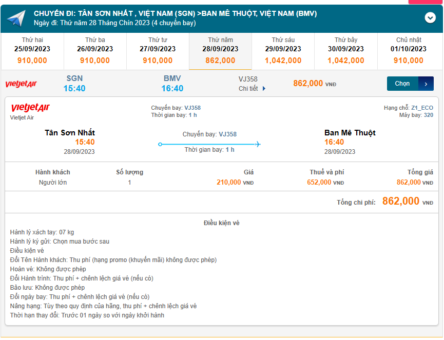 Tân Sơn Nhất (SGN) đến Ban Mê Thuột (BMV) thứ năm 28/09/2023