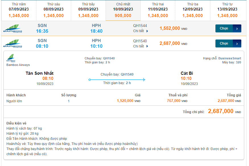 Tân Sơn Nhất (SGN) đến Cát Bi (HPH) chủ nhật 10/09/2023