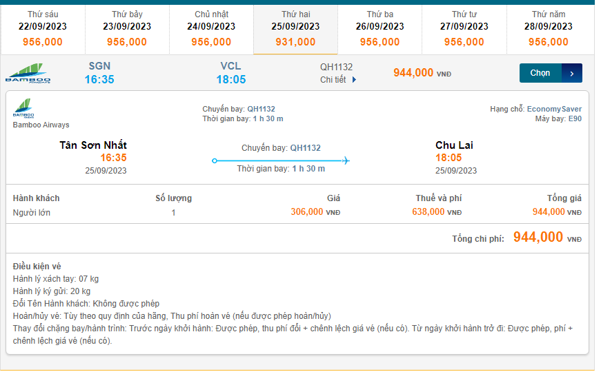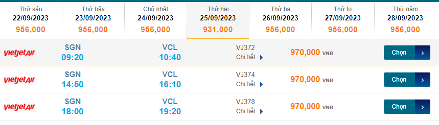 Tân Sơn Nhất (SGN) đến Chu Lai (VCL) thứ hai 25/09/2023