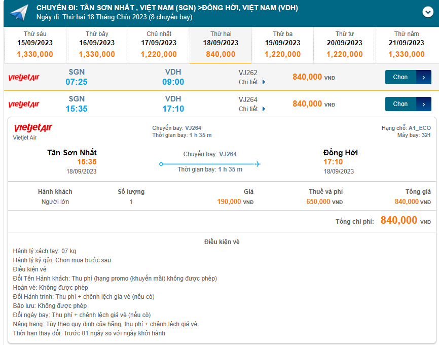 Tân Sơn Nhất (SGN) đến Đồng Hới (VDH) thứ hai 18/09/2023