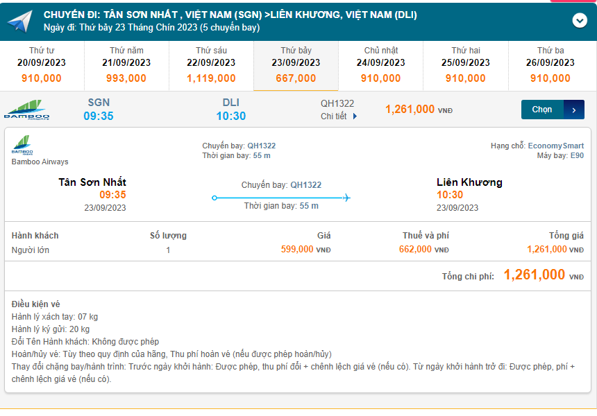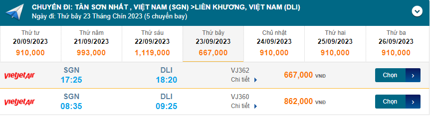 Tân Sơn Nhất (SGN) đến Liên Khương (DLI) thứ bảy 23/09/2023