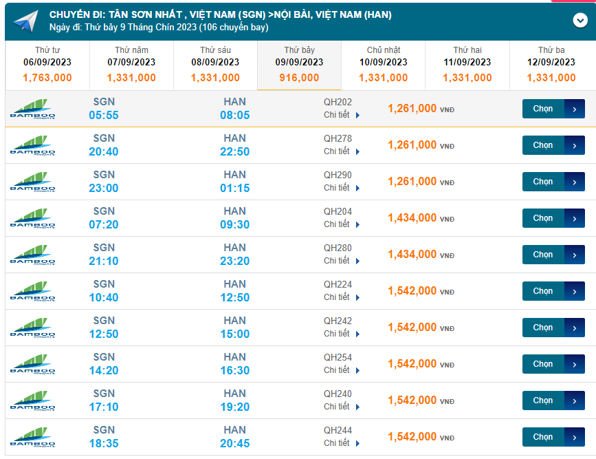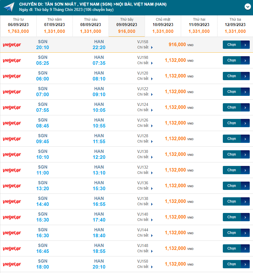 Tân Sơn Nhất (SGN) đến Nội Bài (HAN) thứ bảy 09/09/2023