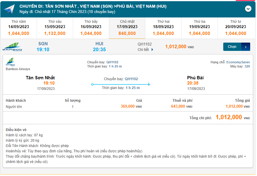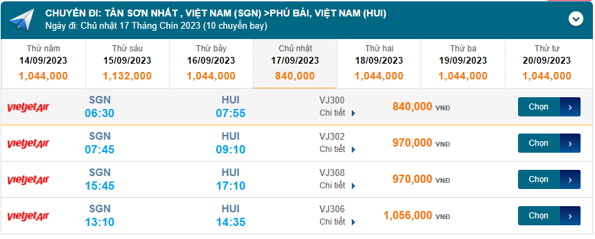 Tân Sơn Nhất (SGN) đến Phú Bài (HUI) chủ nhật 17/09/2023