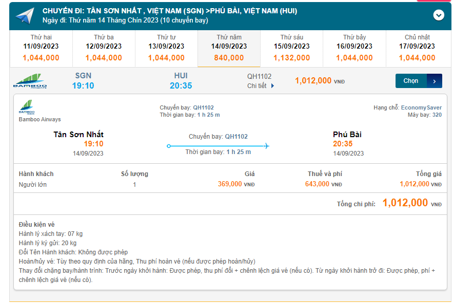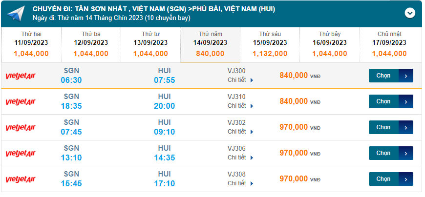 Tân Sơn Nhất (SGN) đến Phú Bài (HUI) thứ năm 14/09/2023