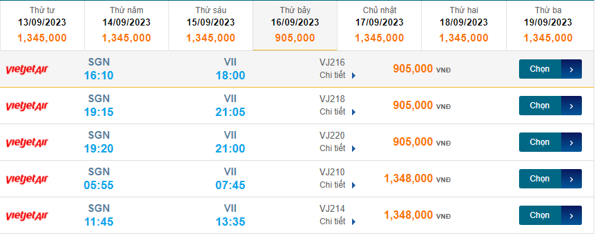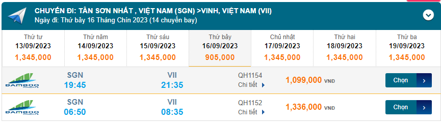 Tân Sơn Nhất (SGN) đến Vinh (VII) thứ bảy 16/09/2023