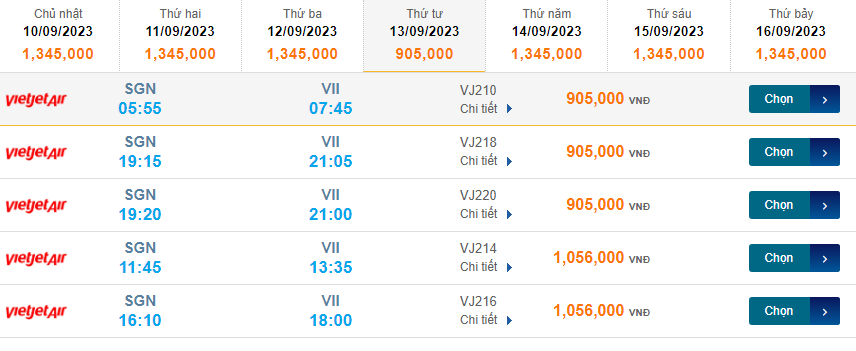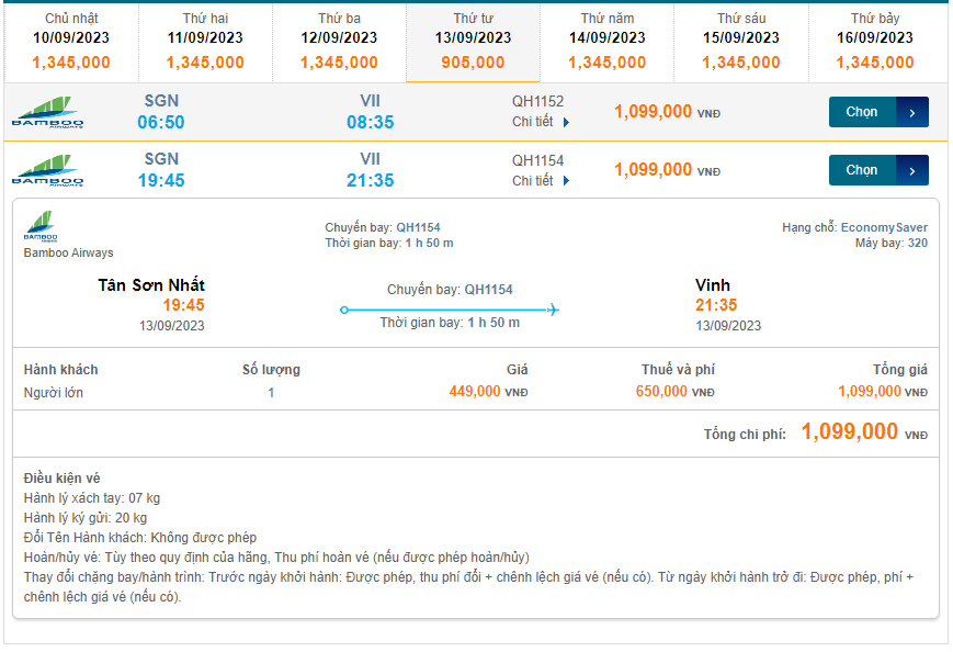 Tân Sơn Nhất (SGN) đến Vinh (VII) thứ tư 13/09/2023