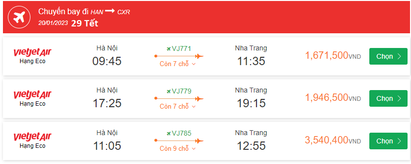 Vietjet Air Hà Nội Cất cánh: 17:25 Ngày: 20-01-2023 Nha Trang Hạ cánh: 19:15 Ngày: 20-01-2023 Chuyến bay: VJ779 giá vé 1,946,500VND