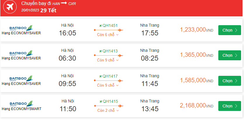 Bamboo Airways Hà Nội Cất cánh: 16:05 Ngày: 20-01-2023 Nha Trang Hạ cánh: 17:55 Ngày: 20-01-2023 Chuyến bay: QH1451 giá vé 1,233,000VND