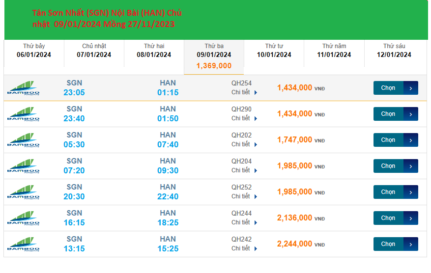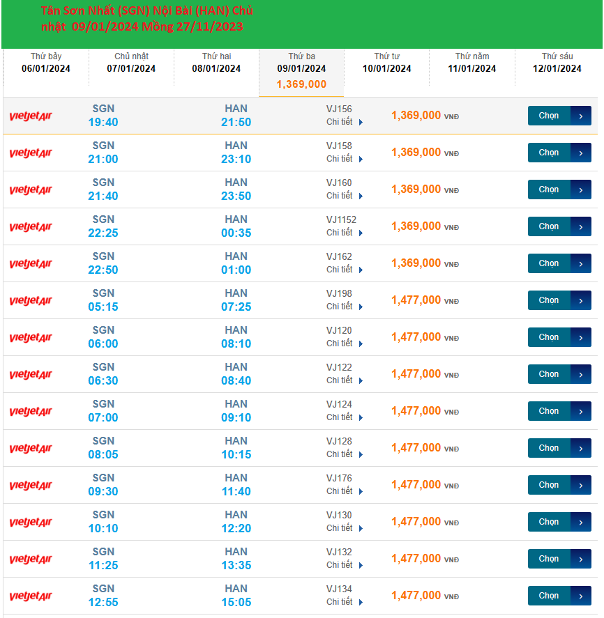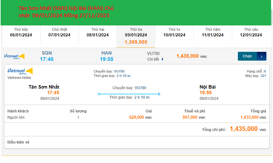 Tân Sơn Nhất (SGN) - Nội Bài (HAN) 09/01/2024 Mồng 28/11/2023