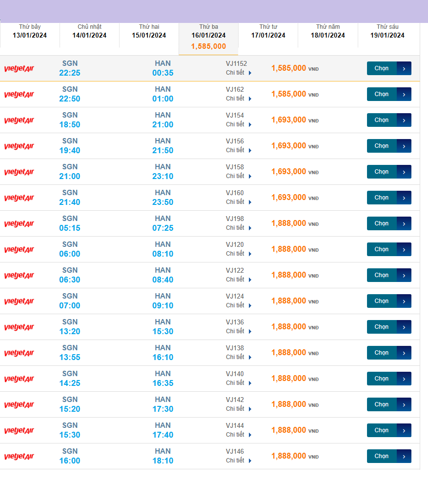 Hãng Vietjet Air VJ162 -> 22 : 50 giá vé máy bay 1,585K