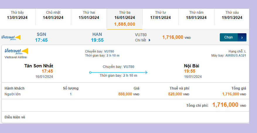 Hãng Vietravel Airline VU780 -> 17 : 45 giá vé máy bay 1,716K