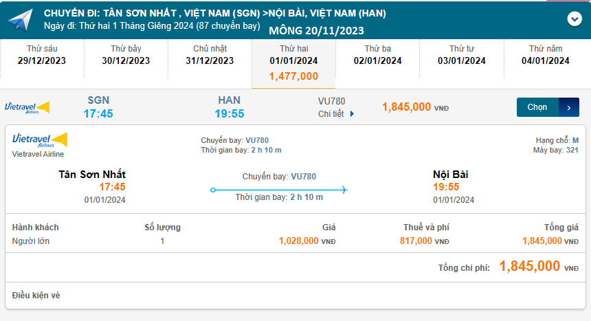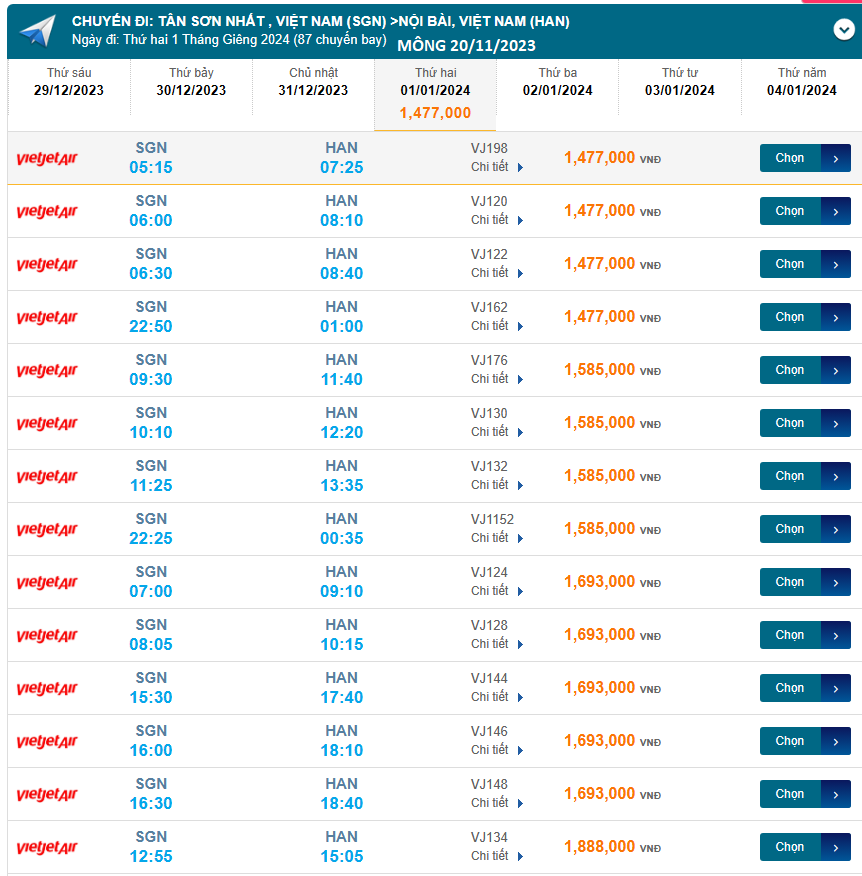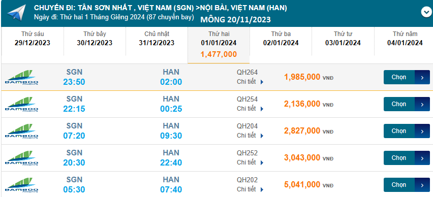 Tân Sơn Nhất (SGN) Nội Bài (HAN) 01/01/2024 Mồng 20/11