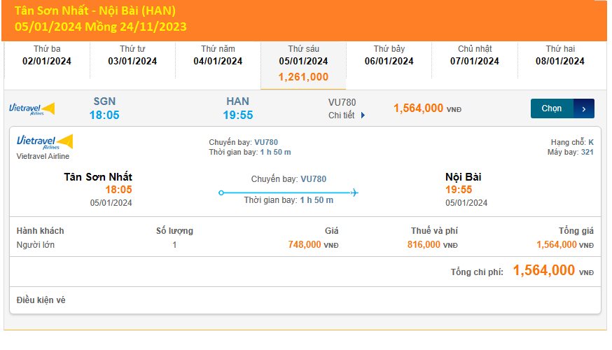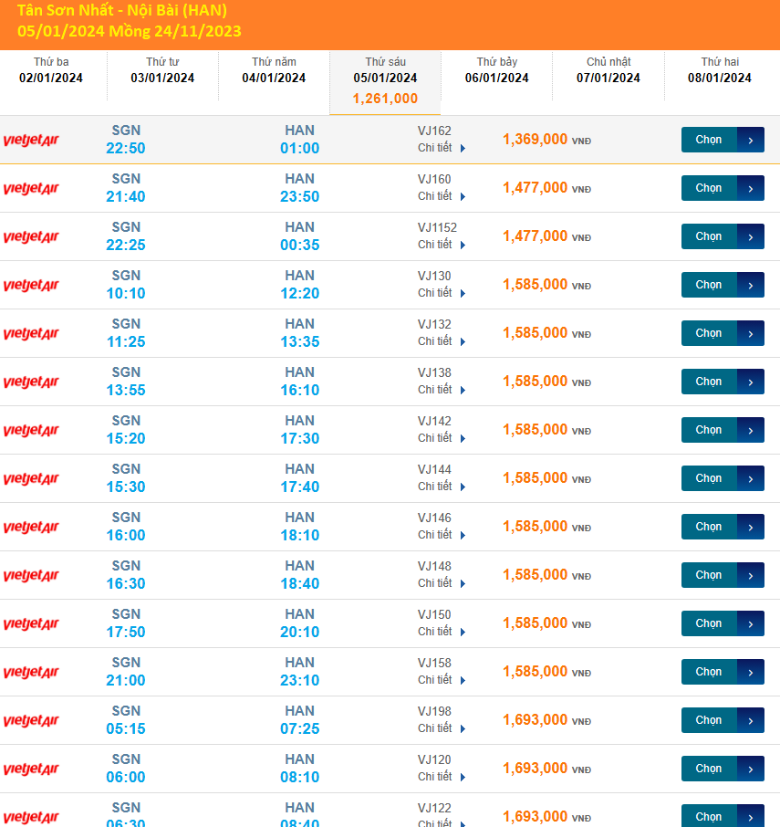 Tân Sơn Nhất (SGN) Nội Bài (HAN) 05/01/2024 Mồng 24/11/2023