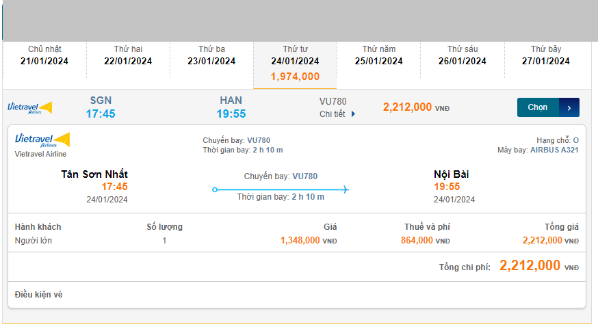 Tân Sơn Nhất (SGN) - Nội Bài (HAN) 24/01/2024 Mồng 14/12/2023